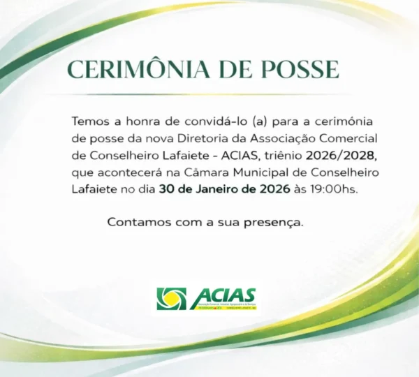 A Associação Comercial de Conselheiro Lafaiete – ACIAS realiza a Cerimônia de Posse da nova Diretoria para o triênio 2026/2028, um momento solene que marca o início de um novo ciclo de trabalho, compromisso e desenvolvimento em prol do fortalecimento do comércio, da indústria e dos serviços de Conselheiro Lafaiete e região.